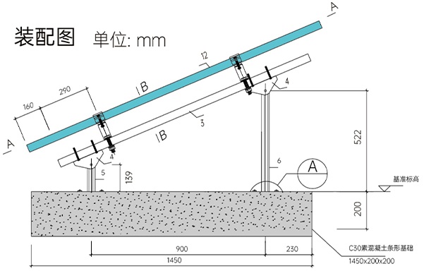 混凝土屋面采用預制條形混凝土基礎,直接安放在屋面上,不對屋面進行二次破壞,確保屋面不漏水,并起到有效隔熱作用,每平方米荷載小于50kg。